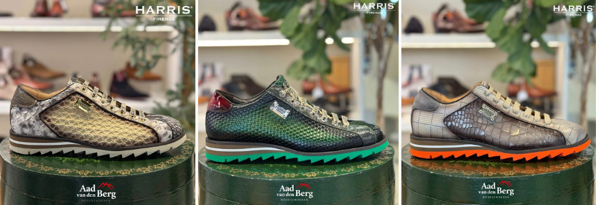 Harris schoenen behoren tot de meest ambachtelijke Italiaanse herenschoenen in onze collectie. Dit merk maakt al sinds 1913 handgemaakte schoenen in Florence en staat bekend om zijn unieke afwerking en bijzondere materiaalcombinaties. Harris werkt met premium kalfsleer en traditionele bewerkingstechnieken, waardoor elk paar een eigen karakter krijgt. Bij Aad van den Berg Modeschoenen gaan we hierin nog een stap verder: wij stellen samen met Harris exclusieve modellen en kleurcombinaties samen, waardoor je bij ons Harris schoenen vindt die nergens anders in Nederland precies zo verkrijgbaar zijn. Omdat ieder paar met de hand wordt gemaakt in Italië, is deze maatwerkbenadering mogelijk en zie je in de schoen naast het Harris-merk ook ons eigen Aad van den Berg Modeschoenen logo in het voetbed van de schoen. De collectie bestaat uit luxe veterschoenen, gespschoenen en opvallende sneakers voor heren die iets bijzonders zoeken. Wie kiest voor Harris, kiest voor authentiek Italiaans vakmanschap, exclusieve herenschoenen en een echt uniek paar aan de voet.
