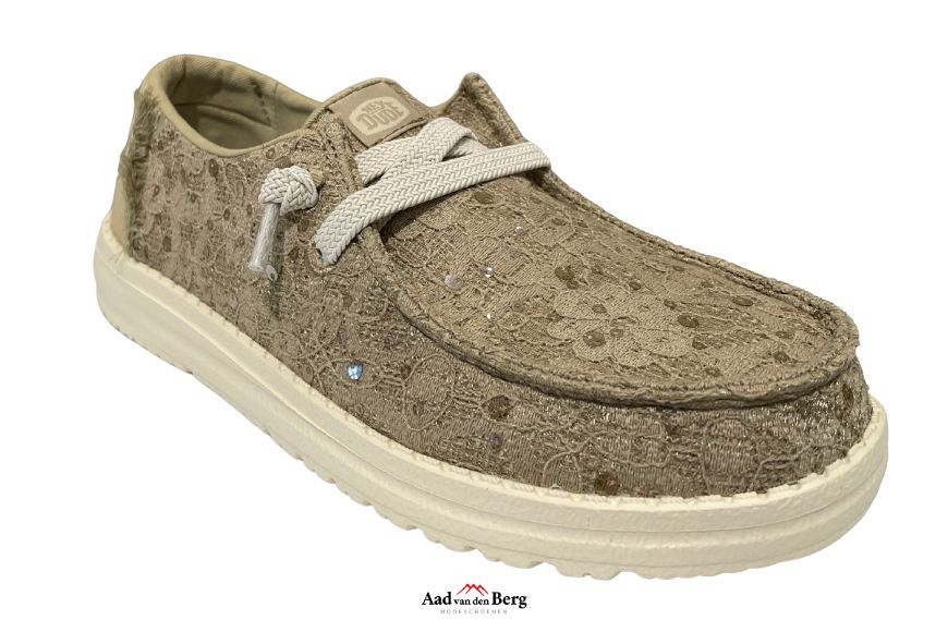 Ontdek de perfecte combinatie van comfort en stijl met de HeyDude damesschoenen veterschoenen in een elegante beige tint. Deze veterschoenen, met bestelnummer 201031034 en fabrikantcode Wendy Sequin 45478, komen uit de nieuwste collectie van het populaire merk HeyDude en zijn een must-have voor iedere modebewuste vrouw. De fabrikantkleur, 3VM olive grey, voegt een subtiele en unieke twist toe aan de klassieke beige kleur, waardoor deze schoenen opvallen met een verfijnde uitstraling.Het gebruik van hoogwaardig textiel canvas zorgt voor een lichte en ademende ervaring, ideaal voor dagelijks gebruik. De stevige rubberen zool biedt optimale grip en duurzaamheid, terwijl de zachte stoffen voering je voeten omhult met comfort. Het voetbed is zorgvuldig ontworpen voor langdurige ondersteuning, waardoor je elke stap met gemak en stijl zet. Of je nu gaat voor een casual dagje uit of een ontspannen avondwandeling, deze veterschoenen voegen moeiteloos een vleugje chic toe aan je outfit.